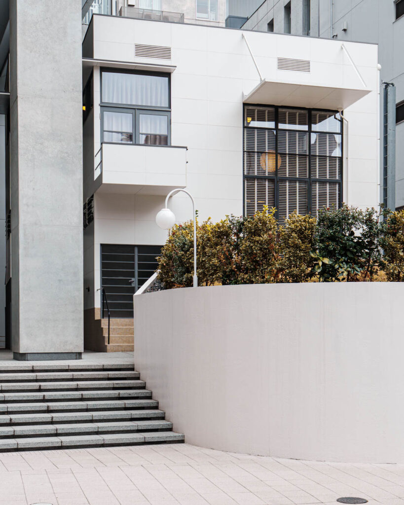 白い外壁、水平窓、フラットルーフ。外観はきわめて近代的。