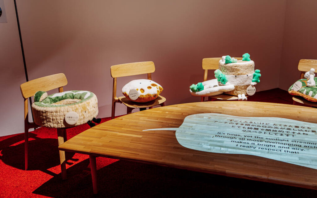 スタジオで制作されたぬいぐるみ模型が並ぶ、遊び心ある空間。